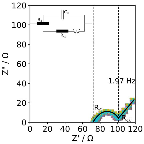EIS Nyquist plots of the CFMB electrode in 2.5 mM [Fe(CN)6]3−/4− supported by 0.1 M PB from 100,000 Hz to 0.1 Hz at OCP voltage (197 mV), where Rct can be resolved as the diameter of the semicircular region showing temporal stability of Rct within RSD of ≤0.3% (20 tests). Inset is the Randles equivalent circuit used to obtain the values of Rs and Rct.