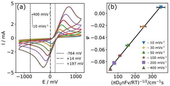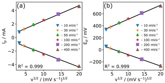 The slope values (obtained from Figure 8a) were −6.36 × 10−3 ± 0.032 × 10−3 A (Vs−1)−1/2 and 7.12 ± 0.44 × 10−3 A (Vs−1)−1/2 for the Ipa and Ipc currents, respectively.