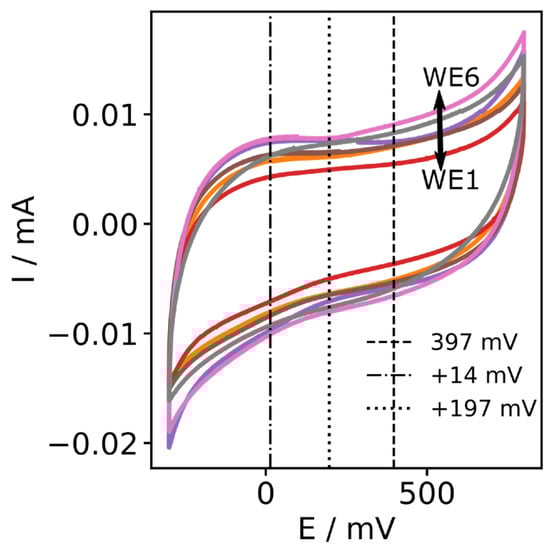 We investigated the reproducibility of the CFMB electrode, possibly effected by variation in the number of microcylinders in the bunch. CVs of six different CFMB electrodes in 0.1 M PB are shown in Figure 9 with a variety of background currents of less than 10% between the different electrodes.
