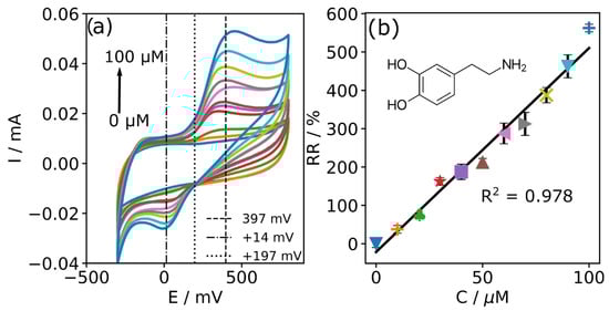 In order to mimic the environment in the human body, a pH of 7.4 was maintained as the condition for the determination of dopamine (DA). CVs of dopamine on a non-modified CFMB electrode in pH 7.4 PB are shown in Figure 10a. The potential window was limited to avoid oxygen evolution (appearing at −764 mV, as shown in Figure 3a). At 0 μM of DA, the CV does not show any apparent redox reaction in the potential window from −300 mV to +800 mV. After the addition of 10 μM of DA, a wave in the oxidation and reduction regions appeared, demonstrating one-electron oxidation of DA similar to that reported previously []. With a higher DA concentration, an oxidation peak for DA at +397 ± 31 mV vs. Ag/AgCl was obtained, demonstrating a similar value as previously reported on GC at +310 mV and SPCE at +370 mV [].