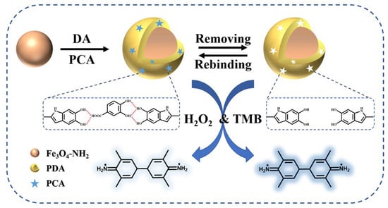 The colorimetric method was used to evaluate the peroxidase-like activity of MIPs@Fe3O4-NH2 before and after the adsorption of protocatechuic acid. In detail, 70 μL of 1 mg/mL MIPs@Fe3O4-NH2 was dispersed into 130 μL of HAc-NaAC buffer solution (pH = 4.0), followed by the addition of 100 μL of 5 mM PCA solution. After 1 h of adsorption, 100 μL of 1 M H2O2 and 100 μL of 5 mM TMB (dissolved in DMSO) were added, and the absorbance of the system was measured by UV spectrophotometer from 350~750 nm after 5 min of reaction at room temperature.