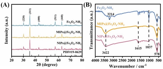 To investigate the effect of dopamine assembly on the substrate materials, X-Ray diffraction (XRD) tests were performed on Fe3O4-NH2, MIPs@Fe3O4-NH2, and NIPs@Fe3O4-NH2. As shown in Figure 3A, the XRD spectra of Fe3O4-NH2 corresponded to the standard card for Fe3O4 (PDF#19-0629), which exhibited good characteristic diffraction peaks at five locations of 2θ = 30.3°, 35.3°, 42.9°, 57.2°, and 62.5°, respectively, corresponding to (220), (311), (400), (511), and (440) crystal planes in Fe3O4. These results indicated that the self-polymerization of dopamine did not change the crystallographic planes of the original substrate. In addition, the assembly process was characterized by FTIR; Figure 3B shows the FTIR spectra of Fe3O4-NH2, MIPs@Fe3O4-NH2, and NIPs@Fe3O4-NH2. The characteristic peak referring to Fe-O is observed at 578 cm−1 in Fe3O4-NH2, MIPs@Fe3O4-NH2, and NIPs@Fe3O4-NH2. The stretching vibration peak of Si-O-Si at 1037 cm−1 is due to the introduction of ammonia using APTES. The peak at 3214 cm−1 in Fe3O4-NH2 corresponds to the characteristic peak of N–H, which also indicates the successful modification of the surface amination of Fe3O4-NH2 nanoparticles. FTIR spectra of MIPs@Fe3O4-NH2 and NIPs@Fe3O4-NH2 appearing in a new characteristic peak at 1615 cm−1 can be clearly observed, which corresponds to the stretching vibrational peak of –NH in the indole ring of dopamine, while a vibrational absorption peak of –OH appears at 3422 cm−1, overlapping with the original amino peak, proving that dopamine on the Fe3O4-NH2 surface was successfully assembled.