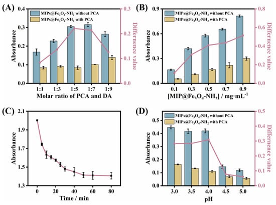 The adsorption of targets is a dynamic process, so the sensor developed based on MIPs needs to reach adsorption equilibrium before the signal can be measured. If the adsorption time is too short, the output signal is in a state of dynamic change, and the unstable detection signal cannot be used as a basis for sensing; too long adsorption time will increase the time of the whole sensing process and reduce the detection timeliness. In this experiment, the UV absorbance of PCA in the supernatant after 5, 10, 15, 20, 25, 30, 40, 50, 60, and 80 min was recorded, and from Figure 5C, we found that with the increase of adsorption time, the concentration of the remaining PCA in the supernatant gradually decreased, and after 50 min, the UV absorption intensity of the system reached stability, which proved that the adsorption equilibrium was reached at this time. Therefore, in the subsequent experiments, the adsorption time was selected as 50 min. According to previous reports, pH has a very strong influence on the activity of nanozymes and reaction with H2O2-TMB [], so we prepared a 0.2 M HAc-NaAc buffer of different pH to investigate the effect of pH on the color development reaction. From Figure 5D, the pH of the reaction systems was in the range of 3.0 ~ 5.0, and the difference of absorption reached the maximum at 4.0, and then decreased sharply after pH 4.5, which is consistent with the optimal reaction pH of the iron tetroxide nanozymes reported before [], so the most suitable reaction pH for this experiment was 4.0.