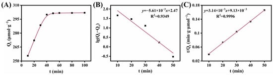 Five hundred μL of 10 mg/mL MIPs@Fe3O4-NH2 and 500 μL of 5 mM solution of PCA were mixed and then shook for 10~100 min; the material was removed using an aqueous filter with 0.22 μm pore size, and the absorbance of the supernatant was measured for the calculation of Q. After that, its kinetic adsorption curve was plotted and the adsorption process was linearly fitted with pseudo-first-order kinetic and pseudo-second-order kinetic according to Equations (1) and (2):