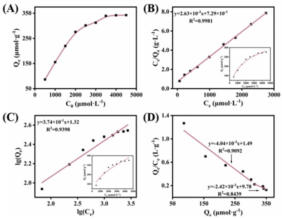 Five hundred μL of MIPs@Fe3O4-NH2 at 10 mg/mL was accurately pipetted and 500 μL of PCA solution with a concentration gradient of 0.2~0.8 mM (final concentration of 0.1~0.4 mM) was added, shaken for 50 min, and the material was removed using an aqueous filter with 0.22 μm pore size. After that, their absorbance was measured for the calculation of adsorption Q. Equilibrium adsorption isotherms of MIPs@Fe3O4-NH2 were plotted according to the relationship between Q and concentration of PCA. Later, the Langmuir isotherm fitted curve and Freundlich isotherm fitted curve were carried out using Equations (3) and (5), and the two isotherm models were linearly analyzed according to Equations (4) and (6). In addition, Scatchard adsorption thermodynamic analysis of PCA adsorption by MIPs@Fe3O4-NH2 was performed using Equation (7):