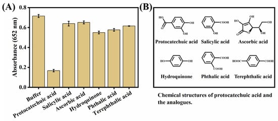 In order to exclude the interference of other structurally similar substances to the sensor and further verify its specificity, salicylic acid, ascorbic acid, p-hydroxyphenol, o- phenylenedioic acid, and p-phenylenedioic acid were selected as analogues (structural formula shown in Figure 9B) and incubated with MIPs@Fe3O4-NH2, which were judged by the absorbance changes of their class chromogenic reactions before and after adsorption. As shown in Figure 9A, the UV absorption value of the sample incubated with PCA was lower compared with other substances, which proved that MIPs@Fe3O4-NH2 had excellent selectivity for PCA and that its recognition sites were able to bind specifically to PCA without interacting with other substances.