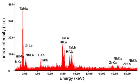 Figure 2. Energy spectra of a section of a (TiNbZrTaHf + (TiNbZrTaHf)N) cermet sample obtained by X-ray microanalysis of its elemental composition.