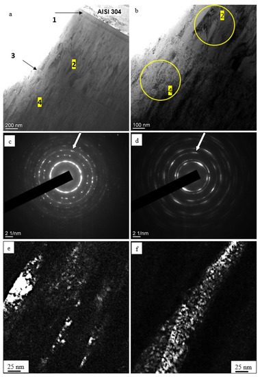 Figure 4. Electron microscopic images showing the structure of (a) (TiNbZrTaHf + (TiNbZrTaHf)N) cermet film: (a,b)—light-field images; (c,d)—microelectron diffraction patterns for (b); (e,f)—dark-field images taken from the [112] (e) and the [022] reflex (f). The reflexes from which the dark-field images were taken are indicated by arrows in (e,f). The foil sections from which microelectron diffraction patterns (c,d) were taken are circled in (b). Substrate: AISI-304 stainless steel.