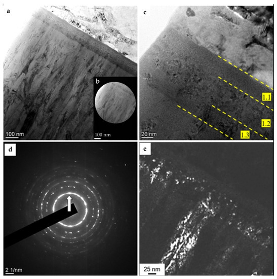 Figure 5. Electron microscopic image of a (TiNbZrTaHf + (TiNbZrTaHf)N) cermet film, taken in the region of formation of the first transition layer: (ac)—light-field images, (d)—microelectron diffraction pattern, (e)—dark-field image taken from the [110] reflex (indicated by the arrow in (d)). Substrate: AISI-304 stainless steel.