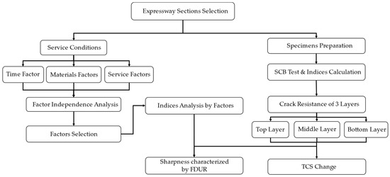 The objective of this research is to identify the factors that independently and significantly influence the crack resistance of pavement specimens and to conduct a statistical analysis of crack curve classification. A schematic diagram of the study is shown in Figure 1. Firstly, the independent significant influence is explored via factors independent analysis to determine whether these factors are significant to the crack resistance of a certain layer. Secondly, an analysis of variance (ANOVA) and Tukey–Kramer comparison analysis of factors on crack resistance is conducted to determine whether a factor significantly affects the crack resistance of specimens. Thirdly, the crack curve statistical analysis aims to distinguish between brittle fractures and ductile fractures on mixture specimens with different factor conditions.
