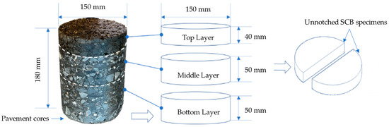 Sections within a 300 m-long drilling zone from the selected sections were chosen. At least 30 m was maintained between each drilled core. The cores were examined to ensure that there was no obvious crack on the core surface and were then labeled with the expressway name, position, and lane. These cores drilled from different pavement sections were then marked and cut into specimens [10]. Since the optimal width for the SCB test is 50 mm and common surface-layer thickness in Jiangsu is 40 mm, the specimen thickness of the surface, middle and bottom layer is 40 mm, 50 mm and 50 mm, respectively. The radius of the SCB specimen was 75 mm. A total of 144 specimens were prepared, with 48 specimens for each layer. Each selected section layer mixture had two parallel specimens to minimize deviation. The specimen preparation is shown in Figure 2.