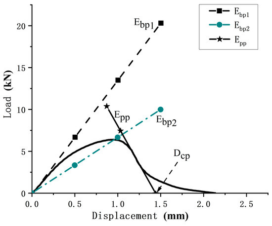 The un-notched SCB test components are shown in Figure 3. The test specimen has a diameter (R) of 75 mm and is placed on two cylinder supports with a width of 0.8 diameter (120 mm). The actuator is placed on top of the specimen and applies a vertical load. To ensure uniform temperature in specimens, the specimens were placed in the environmental chamber at the test temperature for 4 h prior to testing. The test temperature is 15 ℃, and the loading speed is 50 mm/min [24]. In a typical SCB test, the load–displacement curve appears similar to that in Figure 4, showing a single peak curve. This peak can be divided into the before peak zone and the post-peak zone, with the dividing point being the maximum force point. For the intermediate temperature crack test on asphalt mixture, the load–displacement curve shows a continuous ascending curve before peak and a smooth continuous descending curve post peak.