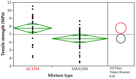 ANOVA and Tukey–Kramer comparison of tensile strength of surface-layer specimens based on the asphalt aggregate ratio.