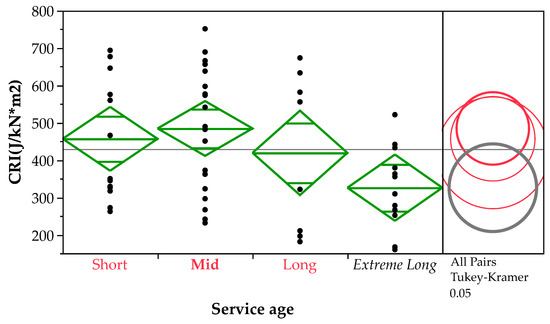 ANOVA and Tukey–Kramer comparison of CRI of bottom-layer specimens by service age.