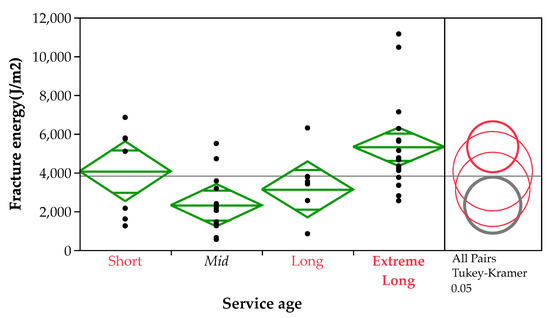 ANOVA and Tukey–Kramer comparison of fracture energy of middle-layer specimens by service age.