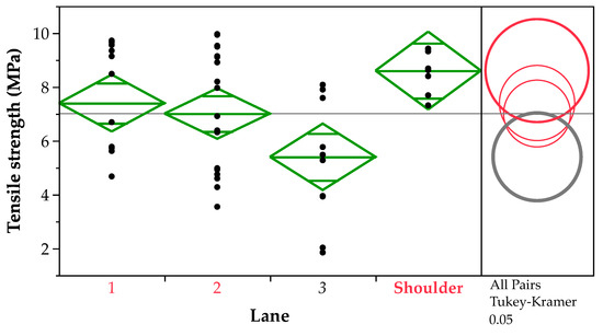 ANOVA and Tukey–Kramer comparison of tensile strength of middle-layer specimens by lane.