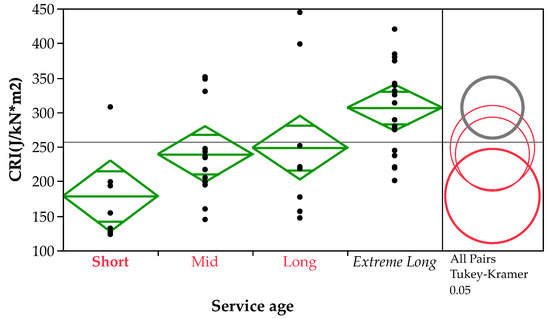 In the graph showing the Tukey–Kramer comparison circles, test results were used to reveal the sensitivities of variables such as mixture type, service age (year), asphalt aggregate ratio and so on. The circles were plotted on the right side of the diamond graph, with each circle corresponding to a diamond on the left. The center of the circle was set to the same value as the mean value, and the diameter was equal to the confidence interval. By analyzing the intersection of any circles, the significance of the parameters could be determined. If any two circles did not intersect or had only a small intersection area, this indicated that the two corresponding parameters were significantly different. When a circle was selected, it was highlighted in red, while the circles representing significant parameters were colored gray and bold [33].