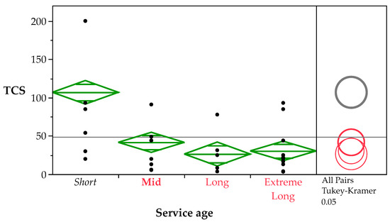 ANOVA and Tukey–Kramer comparison of TCS by section service age.
