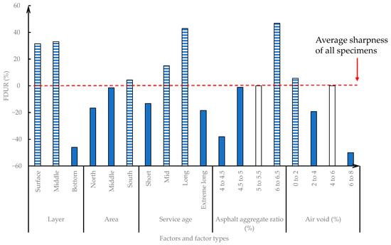 From Figure 16e and Table 9, it is shown the factor “asphalt aggregate ratio” also refers to the mixture types, the 4% to 4.5% asphalt aggregate ratio often suits the bottom layer of the AC25 and SUP25 mixture, the 5% to 5.5% asphalt aggregate ratio often suits the middle layer of the AC20 and SUP20 mixture, the 5% to 5.5% asphalt aggregate ratio often suits the surface-layer AC13 mixture and the 6% to 6.5% asphalt aggregate ratio often suits the surface-layer SMA mixture. The 4% to 4.5% and 6% to 6.5% asphalt aggregate ratios have relatively large absFUDR, which indicates the fracture phenomena of the bottom-layer mixture and surface-layer SMA13 are different in terms of their average curve phenomena. The 4% to 4.5% asphalt aggregate ratio AC25 and SUP25 specimens are harder than others with −38.1% FUDR, and 6% to 6.5% asphalt aggregate ratio SMA13 specimens are softer than others with 48.6% FUDR.