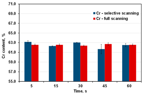 Concentrations of Cr as a function of scanning time determined using portable XRF analyser in selective and full mode.