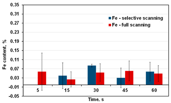Concentrations of Fe as a function of scanning time determined using portable XRF analyser in selective and full mode.