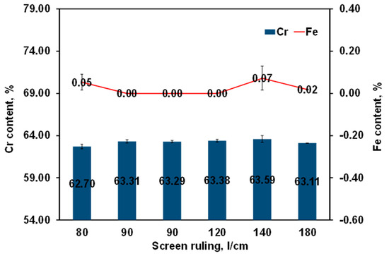 Unused rollers were utilised for this purpose to ensure that the inkpot thresholds were not disturbed during the printing or cleaning process; thus, their structures were not damaged, and the capacities did not change. The data obtained during the analyses are summarised in Figure 3. The percentages of both chromium and iron in the ceramic coatings of the aniloxes were almost identical regardless of the inkwell capacity and screen ruling of the cylinder. The Cr content ranged between 62.70% and 63.59%, and the Fe content did not exceed 0.07%, which confirms that the rollers were new and the ceramic coating was undamaged. Based on the obtained results, the XRF technique is suitable for the analysis of anilox with various screen rulings.