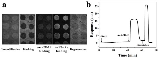 SPRi Chip image of immobilization, blocking, anti-PD-L1 binding, AuNPs-Ab binding and regeneration (a). Real-time SPR sensorgram of the step-by-step manufacturing process: specific recognition and binding of injected sPD-L1 and aptamer pre-immobilized on the chip surface, subsequent signal amplification with anti–PD-L1 and, finally, the material dissociation and regeneration on the chip surface using 100 mM Gly-HCl (pH 2) (b).