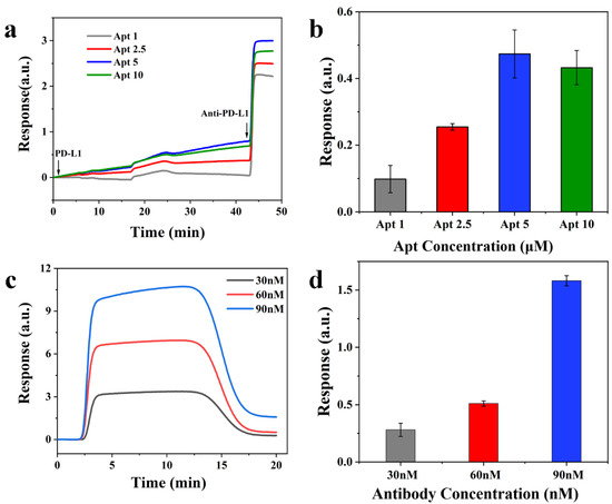 Optimization of aptamer concentration: SPR signal response curves (a) for the aptamer-specific (1 μM, 2.5 μM, 5 μM, 10 μM) recognition of 20 nM sPD-L1 and response values (b). Optimization of anti–PD-L1 concentration: SPR signal response curves (c) for anti–PD-L1 (30 nM, 60 nM, 90 nM), connecting 10 nM sPD-L1 and the response values (d).
