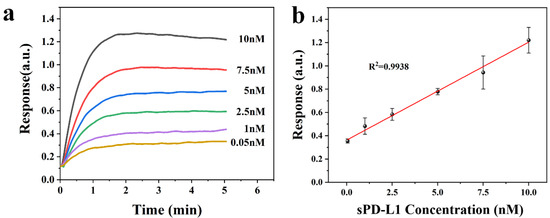 Detection of sPD-L1: the SPR signal response (a) caused by the combination of sPD-L1 (0.05–10 nM) and anti–PD-L1 and their corresponding linear relationship (b).