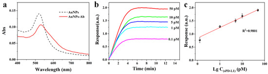 UV–Vis spectra (a) of AuNPs (black) and AuNPs-Ab (red). The detection of sPD-L1: the SPR signal response (b) caused by the combination of sPD-L1 (100 fM–50 pM) and AuNPs-Ab, and their corresponding linear relationship (c).