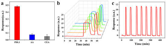 Selectivity of SPRi sensor: 1 nM sPD-L1 caused a greater change in the SPR refractive index than other interfering substances (1 nM CEA or AA), p < 0.01 (a). Repeatability of SPRi sensor: five sets of sensors prepared under the same conditions were used for the detection (b), and an SPRi sensor surface was regenerated multiple times by 100 mM Gly-HCl (pH 2) (c).