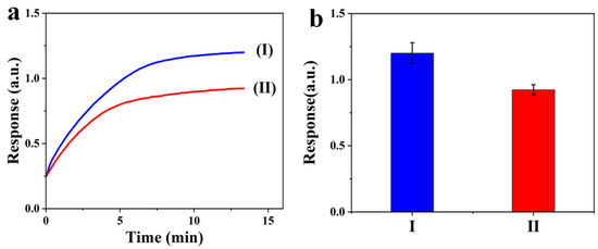 Clinical detection of sPD-L1 is mostly through the analysis of serum samples. The spiked serum samples were detected using the aptamer/sPD-L1/anti–PD-L1 SPRi sensor and evaluated the feasibility of the sensor. To avoid matrix effects on the assay results, the serum was pre-treated as follows. The plasma and perchloric acid were fully mixed at a proportion of 1:1 and centrifuged for 15 min at 4 °C at a speed of 10,000 r/min. The supernatant was extracted as serum. The serum was diluted to 10% with 1× PBS solution and then used in the SPRi labeling test. sPD-L1 was added at a concentration of 10 nM to test the practical feasibility of the constructed sensor in different environments. Then, 10 nM sPD-L1 dissolved in PBS and spiked serum solution containing 10 nM sPD-L1 were individually injected onto the surface of the aptamer-modified chip. Due to the electrostatic adsorption of proteins from human serum samples to the chip surface and non-specific binding to DNA aptamers, this would result in reduced subsequent capture of anti–PD-L1 on the chip surface and diminished SPR signal. The response curve of SPRi sensor signal after subtracting the background signal caused by blank serum is shown in Figure 6a. It can be seen that the serum environment caused some interference in the detection of sPD-L1, and there may still be non-specific adsorption on the chip surface. The response value after stabilization is also shown in the histogram (Figure 6b). The detection rate of sPD-L1 at the same concentration was still 76.95% under serum conditions compared to the buffer environment. Although the clinical conditions are still to be reached, the results show that the designed sensor is able to accurately and sensitively measure sPD-L1 in serum through the strong specificity between PD-L1 aptamers, anti–PD-L1 and sPD-L1. It means that SPRi sensor has great potential in serum sample analysis, which provides the possibility for the subsequent establishment of efficient methods for clinical analysis. However, the concentration of sPD-L1 is lower in clinical samples. Clinical conditions are still to be reached even if the matrix effect of serum has been used as a starting point. In the future work, we will further explore the effect of changes in relevant experimental conditions on detection.
