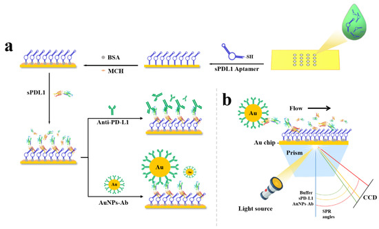 Preparation process of sPD-L1 detection platform (a) and the schematic diagram of aptamer/sPD-L1/AuNPs-Ab sandwich structure for detection of sPD-L1 (b).