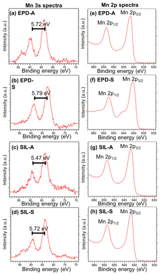 Figure 2. XPS spectra of Mn 3s (ad) and Mn 2p (eh) of Mn3O4 film.