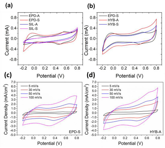 Figure 4c,d displays the CV curves of the EPD-S and HYB-A electrodes at various scan rates. Even at the higher scan rate of up to 100 mV s−1, both electrodes maintained their semi-rectangular CV curves, indicating the stability of the electrodes. The redox peaks were observed to be more shifted in the EPD-S electrode than in the HYB-A electrode, suggesting that the redox reaction on the surface of the EPD-S required longer time for ion diffusion to facilitate the redox reaction [32]. The CV curves of each electrode studied in this work are shown in Figure S2.