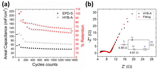 The cycling performance test of HYB-A electrode was tested at a current density of 1 mA cm−2 for 1500 cycles and compared with the EPD-S electrode. As shown in Figure 6a, at the first 50 cycles, the areal capacitance of HYB-A was slightly increased, possibly due to penetration of the electrolyte ion into the internal structure of film. After 150 cycles, the areal capacitance rapidly decreased to 70% of its initial value, and it was subsequently maintained at approximately 56% of its initial value for up to 1500 cycles. In contrast to the hybrid film, the areal capacitance of EPD-S electrode gradually dropped to 75% of its initial value after 300 cycles and still retained at 65% for up to 1500 cycles. This indicated that the electrodeposited layer was robust for both cycling test and high current density. The slightly lower cycling stability of the HYB-A electrode could be attributed to its higher mass loading, which, in turn, resulted in the collapse of the interconnected structure during an extended cycling test. Figure 6b shows electrochemical impedance spectroscopy (EIS) of HYB-A films which had low series resistance (Rs) and charge transfer resistance (Rct) of 4.55 and 4.91 Ω, respectively.