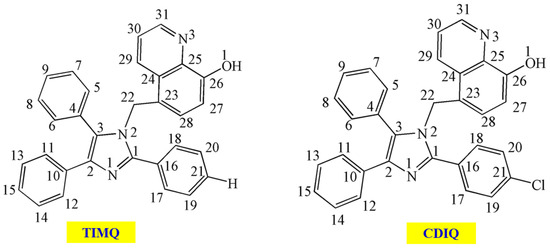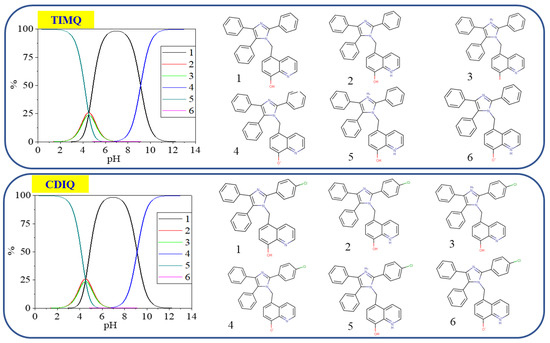 The microspecies percentages of the two investigated inhibitors TIMQ and CDIQ at pH = 0–14.