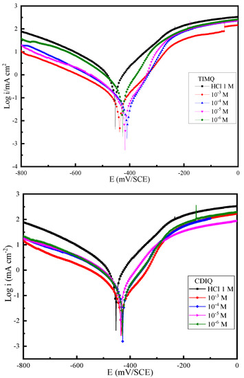 The PDP method was used to evaluate the influence of the varying concentrations of two studied inhibitors, namely TIMQ and CDIQ, on the corrosion behavior of steel in a 1M HCl solution at 298 K. The anodic and cathodic slopes (βa and βc), as well as the corrosion current density (icorr), corrosion potential (Ecorr), inhibitory efficiency (IE%), and other electrochemical characteristics collected from the PDP tests are examined in Figure 2 and Table 2, respectively. Figure 2 illustrates the PDP plots of five concentrations of the inhibitors (TIMQ and CDIQ) for steel in 1M of HCl. The corrosion current densities icorr within the varying concentrations of TIMQ and CDIQ molecules decreased as the concentration of the TIMQ and CDIQ molecules increased, providing excellent inhibitory efficiencies at an optimal concentration (10−3 M) for the two studied molecules (TIMQ and CDIQ) [64,65]. In addition, the higher inhibition efficiencies of the two studied molecules TIMQ and CDIQ (potent inhibitors) were 94.8 and 95.2%, respectively. Furthermore, increasing the concentrations of the two studied inhibitors led to the formation of a layer that further reduced the rate of corrosion due to the attack of chloride ions in the electrolytic medium with the good inhibition efficiency [66,67]. As illustrated in Table 2, the CDIQ inhibitor presented a higher inhibition efficiency compared to the TIMQ molecule. In addition, the displacement of the corrosion potential values for the two studied TIMQ and CDIQ molecules compared to the 1 M HCl solution alone were essentially less than 85 mV/SCE. Thus, the two investigated molecules (TIMQ and CDIQ) inhibited both anodic and cathodic reactions associated with the corrosion of steel in an acidic medium, and were suggested to be mixed-type inhibitors [22,62,68,69,70]. Additionally, the anodic and cathodic Tafel slope (βa and βc) values changed in the existence of four concentrations of the two investigated molecules, which reflected the effects of the TIMQ and CDIQ molecules on the kinetics of the anodic and cathodic mechanism.