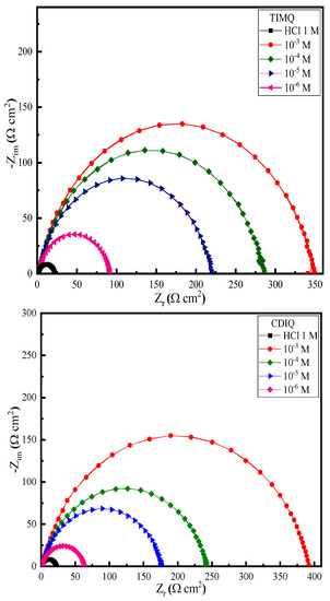 The corrosion protection was investigated and addressed based on the charge transfer resistance measurements. Additionally, the performance of the CS electrode as a corrosion inhibitor improved in direct proportion to the Rct value. According to the results analyzed and compiled in Table 3, the same Rs values indicated the similarity of the electrolyte conductivity. According to the findings examined and discussed in Table 3, the CS immersed in an aggressive medium exhibited the lowest Rct value, which indicated a low corrosion resistance. Additionally, since the Rct was low, the ion diffusion rate was high under the vacuum conditions [77,78,79]. This outcome caused a layer to build on the CS electrode surface. Additionally, in the existence of the ideal concentration of CDIQ, the charge transfer resistance values for carbon steel surfaces were higher than those in the absence of TIMQ, and its inhibitory efficiency also increased. This result was confirmed by the results obtained in the PDP study. In addition, for the steel electrode surface, the Cdl values decreased as the concentrations of the two studied molecules increased, compared to the pure 1M HCl solution, due to a decrease in the dielectric constant or an increase in the thickness of the surface layer [71,80,81,82]. Due to the differences in the surface finish of the steel electrode, the influence of the metal structure and surface on corrosion was greater, leading to increased protection.