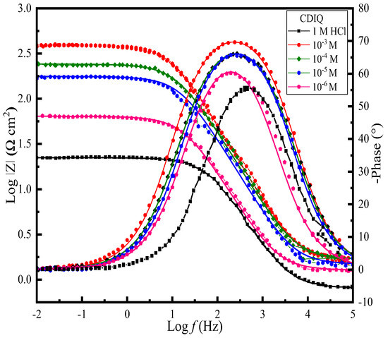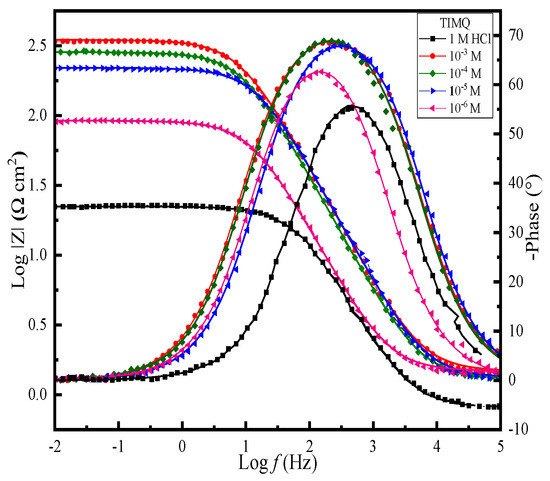 EIS (Bode and phase angle plots) of a 1 M HCl medium with four concentrations of the inhibitors TIMQ and CDIQ at 303 K.