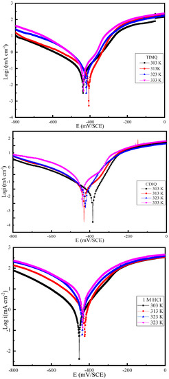 To identify the interaction mechanism between the studied inhibitory compounds and the metallic surface, a temperature effect was investigated at four temperatures in a corrosive environment (Figure 6). The stationary electrochemical parameters, such as Ecorr, icorr, βa, and βc as well as the inhibitory efficiency, were calculated using varying temperatures on the corrosion of the steel area in both noninhibited and inhibited electrolytic media with the optimum concentration (10−3 M) of the two studied molecules (TIMQ and CDIQ), as summarized in Table 4. The results illustrated in Table 4 suggest that the corrosion current density increased as the temperature increased in a corrosive environment with and without 10−3 M of TIMQ and CDIQ, respectively. These increases were explained by the activation reactivity of the corrosive environment [83,84]. The findings presented in Table 4 show that the inhibition performance decreased as the temperature increased since the equilibrium on the CS surface shifted from adsorption to desorption as the temperature increased.
