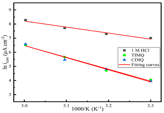 where icorr, A, R, T, Eacv, and N are the current density, the Arrhenius factor, the molar gas constant, the absolute temperature, the activation energy, and Avogadro’s number, respectively. Additionally, ΔSacv and ΔHacv denote the standard activation entropy variation and the standard activation enthalpy variation. The calculated thermodynamic parameter values are listed in Table 5. Figure 7 illustrates the logarithm of the icorr (ln (icorr)) as a function of the 1000/temperature with and without 10−3 M of the two studied molecules (TIMQ and CDIQ). According to the data illustrated in Figure 7, the correlation line curve indicated that the correlation coefficient for 1 M HCl was 0.967 and the coefficients for the two elaborated molecules TIMQ and CDIQ were 0.986 and 0.971, respectively. Additionally, the Eacv values measured for the 1 M HCl solution and the two studied molecules TIMQ and CDIQ were 35.4, 69.8, and 71.3 kJ/mol, respectively. The activation energy values for the environments suppressed with TIMQ and CDIQ were higher than those of the blank environment, as listed in Table 5, indicating that the corrosion mechanism was altered and the steel area’s corrosion was blocked by a physisorption process [72,81,86]. Furthermore, the curves of the logarithm of icorr/T as a function of the 1000/T for the media no inhibited and inhibited by the two molecules TIMQ and CDIQ are illustrated in Figure 8. The study of the enthalpies ΔH° values was positive, as evidenced by the data in Table 5, which demonstrated the endothermic character of the process of adsorption and the dissolution of the steel metallic area in a corrosive environment. The ΔSacv values for the no inhibited media had a negative sign, whereas the values for the media inhibited by the two examined inhibitors had a positive sign, as detailed in Table 5. Based on these findings, the speed-determining phase of the activated complex involved an association step rather than a dissociation step, increasing the order and decreasing the disorder from the environment to the activator complex [69,87,88].