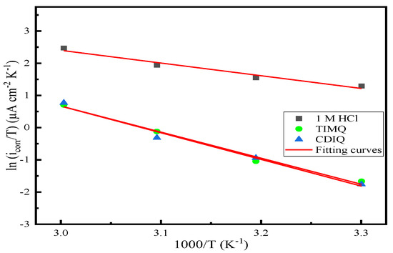 Logarithm of icorr/T as a function of the 1000/T for the media uninhibited and inhibited by the two molecules TIMQ and CDIQ.