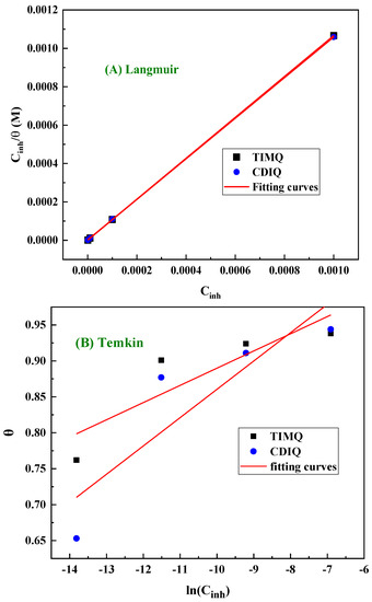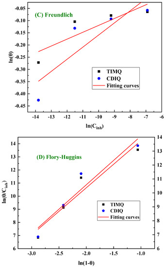 Langmuir (A), Temkin (B), Freundluich (C), and Flory–Huggins (D) adsorption isotherm models for CS inhibited with 10−3 M of TIMQ and CDIQ molecules in the electrolytic medium.