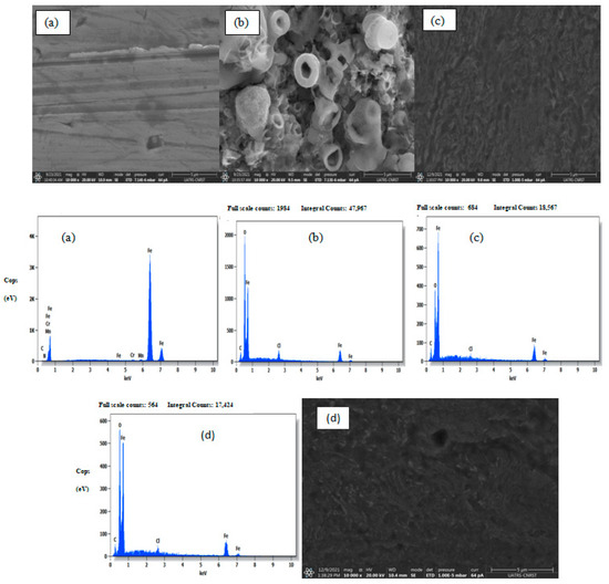 SEM images and EDS spectra of the CS (a) uninhibited (b) and inhibited with 1 mM of TIMQ (c) and CDIQ (d) in the electrolytic medium at 303 K.