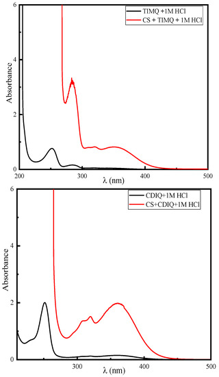UV–vis spectrum for TIMQ and CDIQ in the absence and existence of CS.
