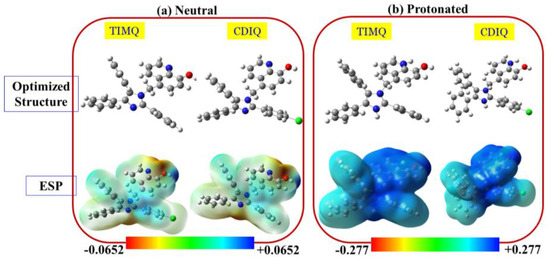 The two examined inhibitors’ optimal geometrical structures and molecule electrostatic potential maps are shown in Figure 13. The molecular electrostatic potential (ESP) maps were utilized to qualitatively indicate and visualize the active centers that are susceptible electrophilic and nucleophilic attacks. These maps switched from a negative to a positive potential as follows: red (−Ve) < orange < green < blue (+Ve). The potential values were in the range of −0.0652 to +0.0652 au for the neutral molecules and from −0.277 to +0.277 au for the protonated species. In these maps, the negative regions (strong red color) correspond to the regions that exhibited a tendency to transfer electrons from the inhibitor to the metal surface, which were responsible for electrophilic attacks. The positive potential (blue regions) refer to the parts of the molecule that exhibited a capability to receive electrons from the metal surface, which consequently, were responsible for nucleophilic attacks [95,96]. In the neutral forms, the imine nitrogen atoms in both the pyridine and imidazole rings, as well as the π-electron of the phenyl groups, were shaded with the red color at the center, which were responsible for donating electrons to the unoccupied 3D orbitals of the Fe metal. The part of the molecules that captured electrons from the occupied 3D orbitals of the Fe metal were shaded by a dark blue color, such as some of the carbon atoms of the from the phenyl ring of the quinoline moiety. The ESP maps of the protonated forms were mostly covered by a blue color due to the protonation of the two nitrogen atoms that exhibited sp2 hybridization. These results indicate that in acidic medium the two inhibitors could interact with the metal surface due to the donation of the π-electrons from the phenyl groups.