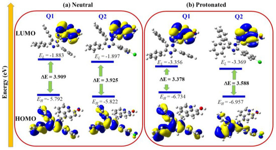 HOMO and LUMO molecular orbital diagrams of the TIMQ (Q1) and CDIQ (Q2) inhibitors in their (a) neutral and (b) protonated forms. The energy level diagrams of the investigated molecules are also depicted.