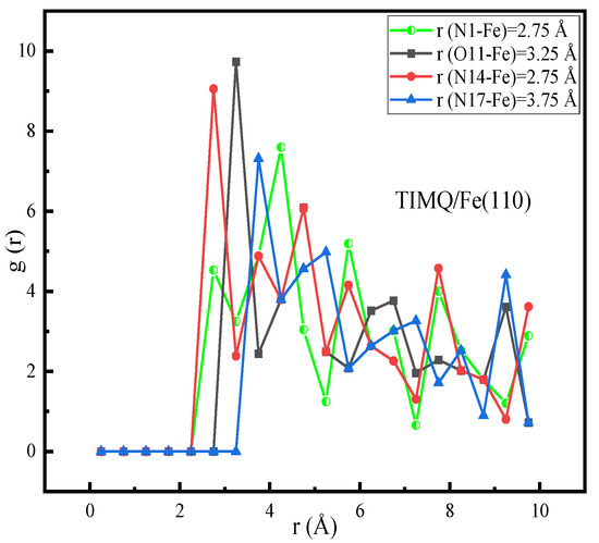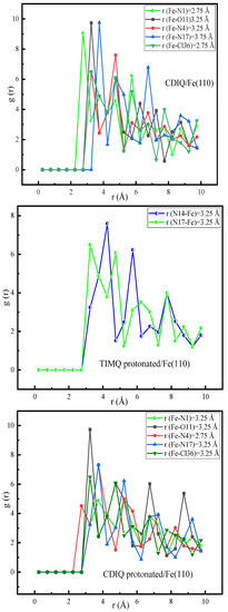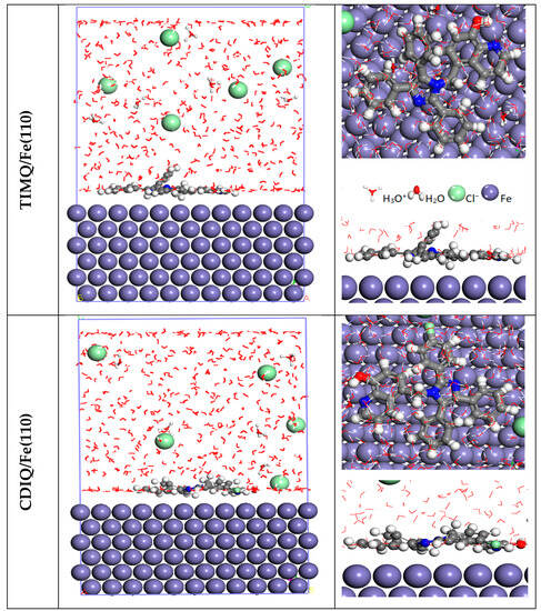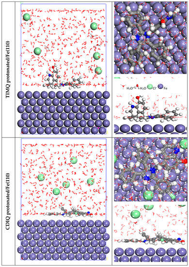 MD simulations were used to examine how TIMQ and CDIQ interacted with the Fe(110) systems. This approach was produced via the Materials Studio/2016 program Forcite module [61,62]. A simulation box (27.30 × 27.30 × 37.13 Å3) with an 11 × 11 unit cell was used to simulate the particle movements (500H2O, 5H3O+, 5Cl−, and imidazol analogs) within the simulation box with a 27.13 Å3 vacuum at a temperature of 303 K controlled by the Andersen thermostat in the constant number (N), constant volume (V), and constant temperature (T) (NVT) ensemble, a simulation time of 1000 ps, and a time step of 1.0 fs [63].