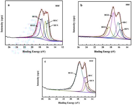 The elemental composition and chemical bonds of Zr(Hf)xCN coatings, in particular the Hf bonds, were investigated via XPS. The XPS spectra of Hf4f for the Zr(Hf)xCN coating are shown in Figure 1. Figure 1a,b exhibit the Hf4f peaks at 15.19, 16.54, 17.6, and 18.19 eV corresponding to Hf–N bonding, Hf–C bonding, Hf–Zr bonding, and Hf–O bonding, respectively. With the increase in the content of Hf element to 7.33% (Figure 1c), the Hf4f peak at 18.19 eV disappeared and the area of Hf–Zr peak at 17.6 eV increased. The content of Zr element decreased with the increase in Hf content. However, the content of C element and N element exhibited a slight change, and are clearly presented in Table 1. Notably, similar results were reported in studies in the literature [17,18].
